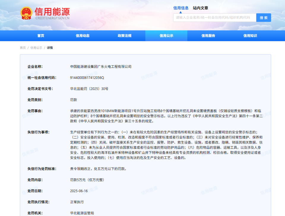 6月16日,信用能源公布了中国能源建设集团广东火电工程有限公司行政处罚决定。华北监能罚〔2025〕30号处罚决定书文号显示,该单位承建的京能蒙西灵改1018MW新能源项目1号升压站施工现场8个围墙基础开挖孔洞未设置硬质盖板(仅铺设轻质支模模板)和临边防护栏杆;8个围墙基础开挖孔洞未设置明显的安全警示标志。以上行为违反了《中华人民共和国安全生产法》第四十一条第二款和《中华人民共和国安全生产法》第三十五条的规定。华北能源监管局对其作出罚款5万元处罚。