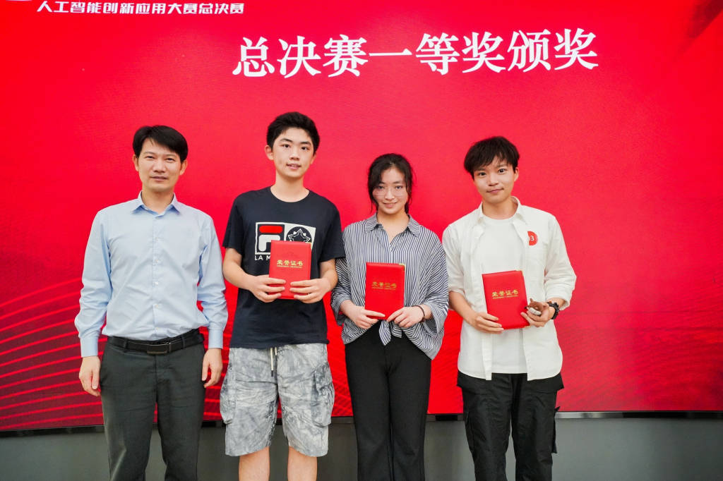 吴健(左一)为大语言模型创新应用开发赛道一等奖“将无同:AI+文言文”团队颁奖。