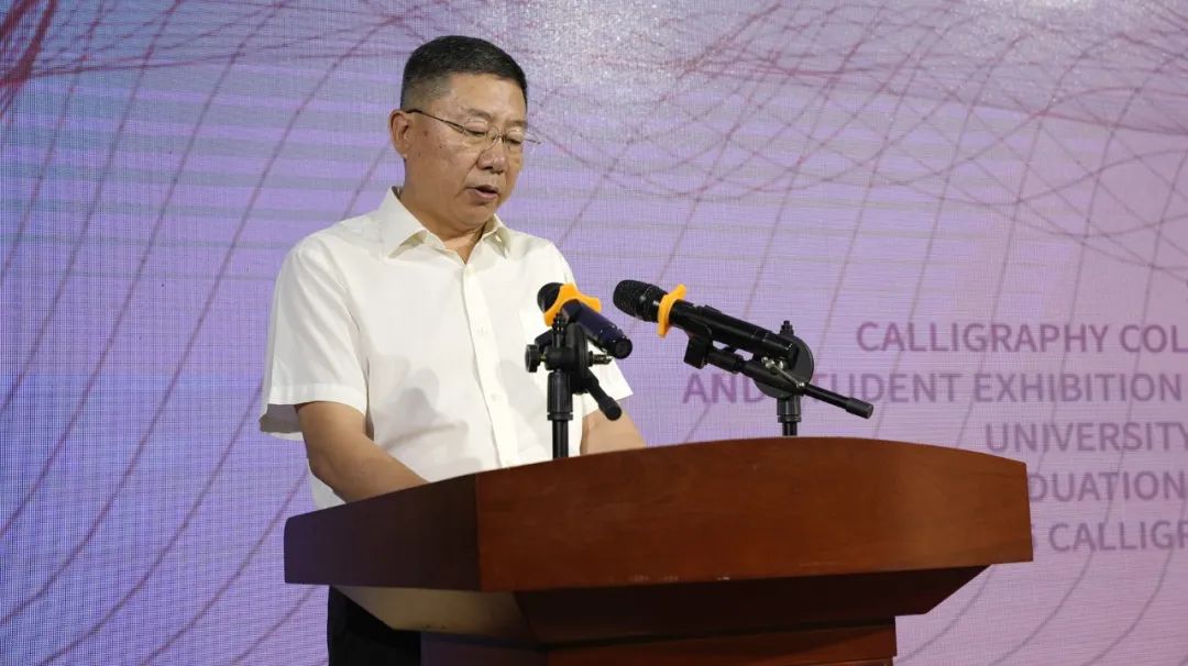 彭丽在致辞中介绍了学校及书法学院在学科建设、科研与艺术实践等方面的成果。她指出,本次展览依托泰安与泰山这一中华文明重要发祥地,用书法篆刻艺术展现齐鲁山河文化、传递创新精神,切实将毕业展览写满齐鲁大地,践行我校师生传承齐鲁文化的担当。最后,她寄语毕业生将所学化为智慧,追寻艺术梦想、服务社会并实现个人价值,铭记“闳约深美”校训,以广博学识和钻研精神传承弘扬中华优秀传统文化。