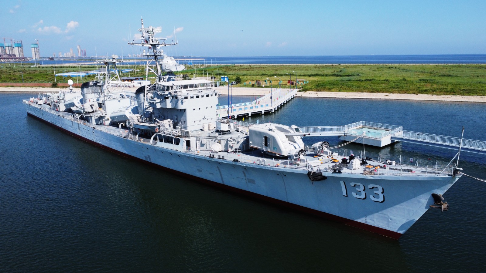 “此次焕新,景区空间承载力与美观度将同步跃升。例如,北岛焰火观演区扩大至4.6万平方米,水上交通系统也增设了840米水上栈道,既可让游客饱览航母编队的钢铁雄姿与渤海湾暮色夜景,也能通过高效分流有效纾解夜场高峰期人流压力。”该工作人员告诉记者,此外,园区全面提升人性化服务水平,通过优化绿化布局、增强夜景照明、完善无障碍设施等公共服务设施方面,确保游客安全便捷地游览,为暑期活动的多样业态注入新活力。(泰达航母主题公园供图)