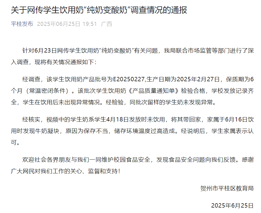 广西贺州通报“学生奶‘纯奶变酸奶’”:该批次学生奶检验合格