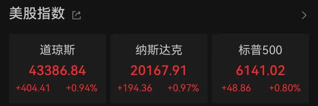 北京时间6月27日凌晨,美股三大指数集体收涨,道指涨404.41点,涨幅为0.94%,报43386.84点;纳指涨194.36点,涨幅为0.97%,报20167.91点;标普500指数涨48.86点,涨幅为0.80%,报6141.02点。