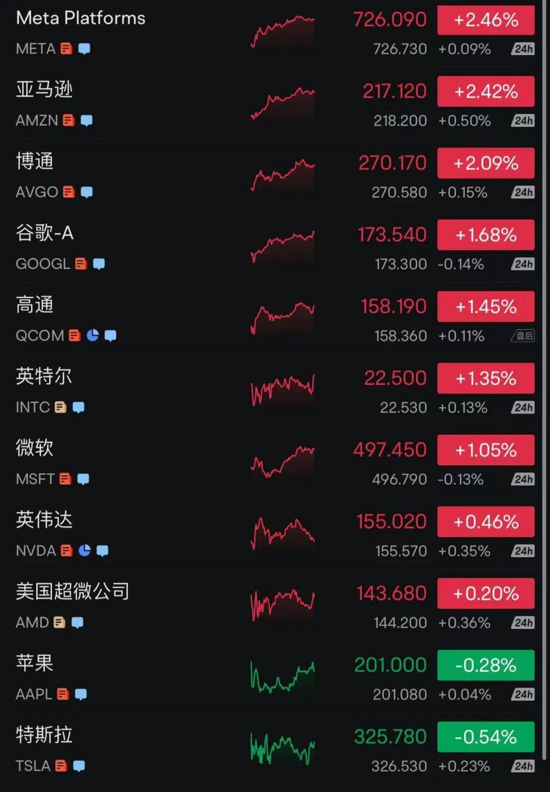 大型科技股多数上涨,Meta涨2.46%,亚马逊涨2.42%,谷歌A涨1.68%,微软涨1.05%,英伟达涨0.46%,苹果则收跌0.28%,特斯拉跌0.54%。
