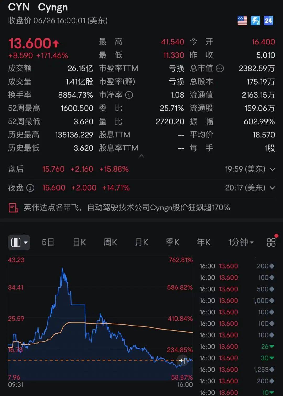 自动驾驶技术公司Cyngn股价暴涨171%,因英伟达博客文章提到,Cyngn是自主移动机器人领域的先驱,目前正在将其DriveMod技术集成到英伟达的“Isaac Sim”中,以实现对先进自主操作的大规模、高保真虚拟测试。
