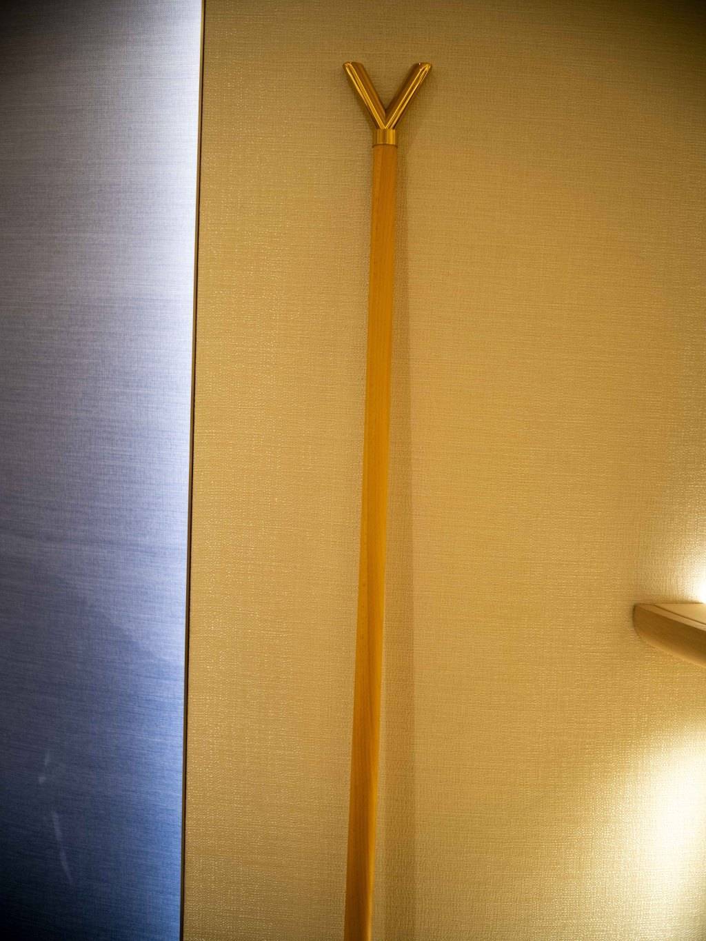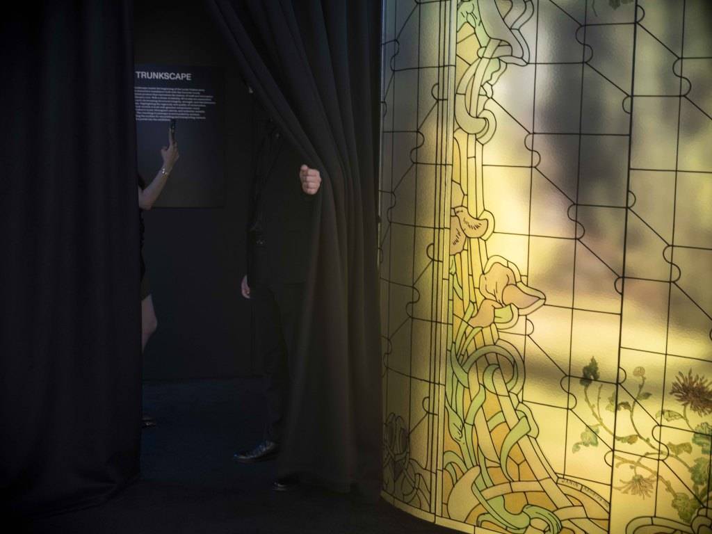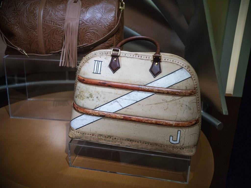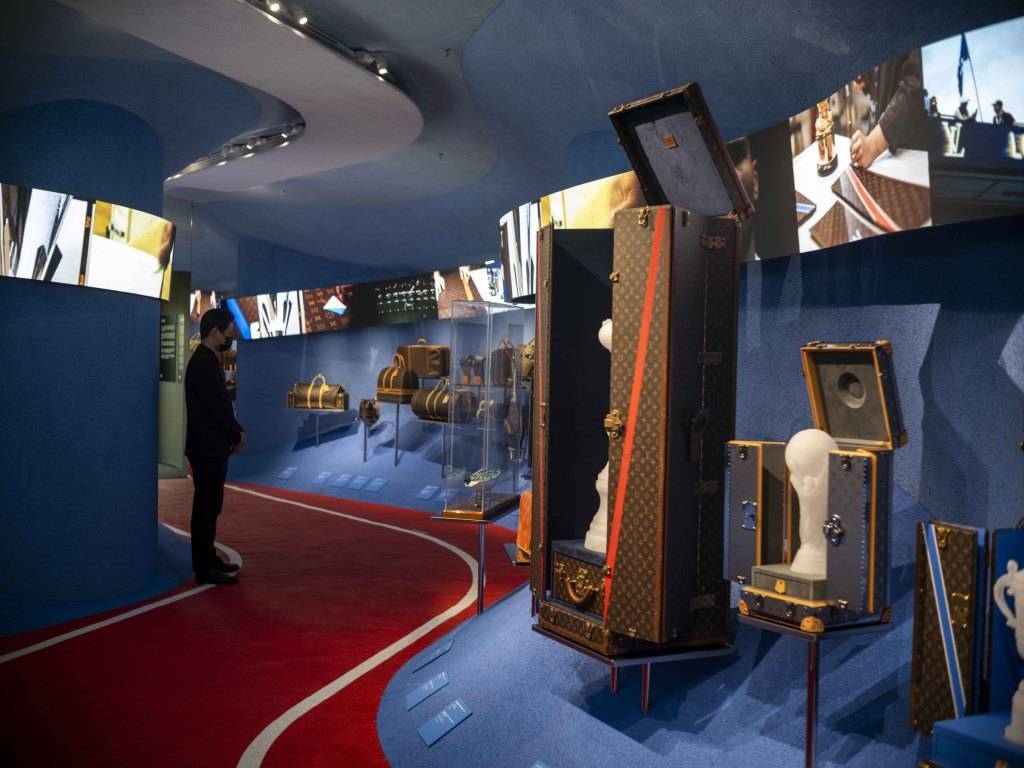 澎湃新闻记者进入“巨轮”内部,由“水面”构成的一条通道引导参观者进入深处,“水面”的两边是成排的LV箱子构成一个船顶装置,船舷两边是两整面墙的LED屏,画面变幻,有湖光山色、桂林山水和黄浦江畔的外滩钟楼。此后则是LV带来的功能各异、不同材质的箱子,从中清晰可见随着科技的进步、材料的研发、人们生活方式的改变,箱体的造型和功能也逐渐有了变化。其中作家海明威曾经也有过的一款皮箱,可携带书籍和打字机,设计得极为精巧。20世纪初,海明威曾在路易威登定制过书箱,让他得以与珍贵书籍同行的旅行硬箱。帆布束带与可定制的抽屉可以满足书籍与各类文具在旅行与居家生活中的收纳需求。穿过色彩斑斓的香水瓶房间,豁然开朗的是展陈LV的各种制作工具和一些拍摄于1903年的黑白照片。照片上,年轻的法国小伙子站在宽敞的车间里,身体笔直,双眼炯炯有神,他们的手下是经典造型的箱体,其中一位甚至还拿着一把木锯。相邻房间展示与体育相关的物品,其中有球鞋,有当年的老画刊,也有介绍专门安放各种比赛奖杯的皮具。抵达二楼,灯光瞬间明亮起来,琳琅满目的各色商品涌入眼帘,现场导览小哥小姐上前热心地介绍,他们十分熟练并专业,派头十足,满足观众所需所想。