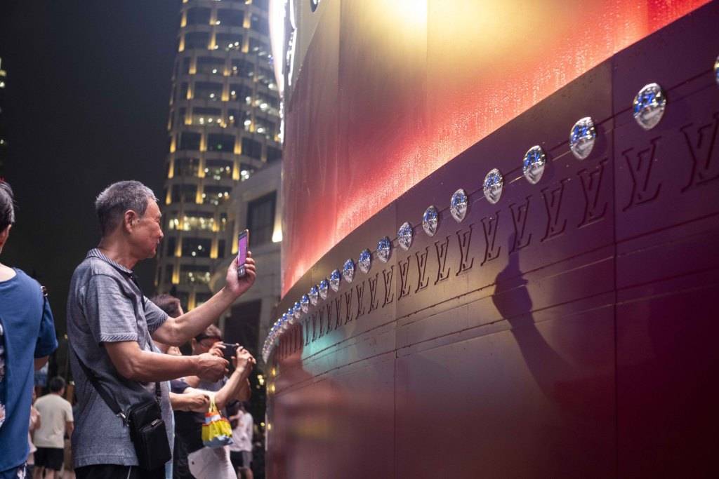 这一举措不仅拉动了LV自身门店的客流与销量,更带动了周边商圈的联动效应。据现场增派过来的一名警务人员说,“人流车流显著增加,但是我们要及时制止人流为了拍照进入机动车道。”周边沿街一排商铺门口站了好几圈人,店铺内同样有不少人,旺铺之势强劲。一对恋人兴致勃勃地相互拍照,由于没有专业相机,希望澎湃新闻记者用专业相机给他们留下“珍贵记忆”,并承诺可以支付拍摄费。“巨轮”在夜幕下散发着银色的光芒,它投射下来的光亮照亮船舷底下每一张脸,上海滩遍地是机会。
