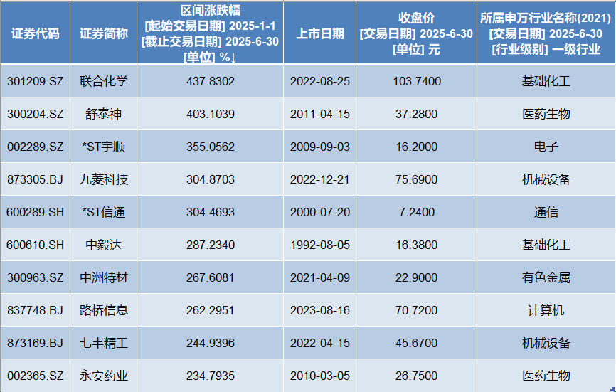 2025年上半年涨幅前十的个股中,科技股和医药股占据“半壁江山”。其中,联合化学(301209)以上半年437.83%的涨幅“夺魁”。