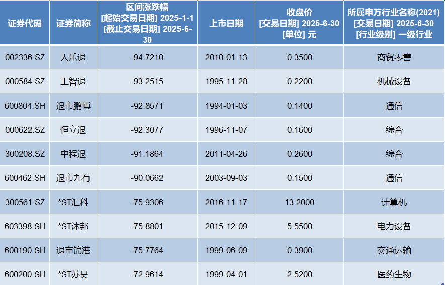 跌幅方面,Wind数据显示,2025年上半年股价跌幅排名前十的个股,均为退市股和ST股。