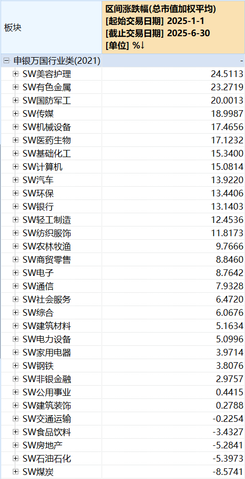 具体来看,美容护理板块2025年上半年领涨,板块年度涨幅为24.51%。有色金属、国防军工等板块紧随其后,2025年上半年涨幅同样超过20%,分别上涨了23.27%、20.00%。