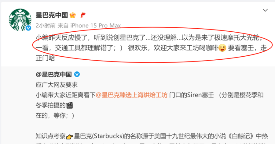 6月26日,@星巴克中国 发文,“小编昨天反应慢了,听到说创星巴克了……还没理解……以为是来了极速摩托大光轮。一看,交通工具都理解错了,很欢乐,欢迎大家来工坊喝咖啡,要看塞壬,走正门。”