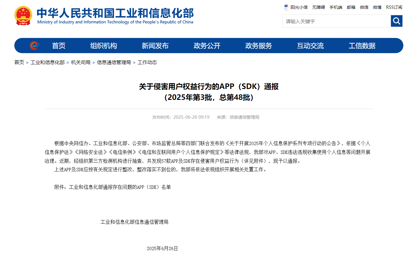 6月26日,工信部发布2025年第三批侵害用户权益APP通报,57款违规应用及SDK因“信息窗口乱跳转、无法关闭”“APP频繁自启动和关联启动”等问题被点名,再次将移动互联网生态中“技术霸凌”推向舆论焦点。