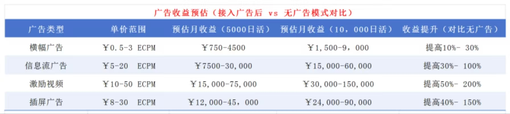 从该名工作人员提供的《广告收益预估对比表》可以看出,广告类型分为横幅广告、信息流广告、激励视频、插屏广告。其中,激励视频类型的广告月收益最高,以1万日活(每日活跃用户)为例,预估月收益最高可达15万元,对比无广告,收益最高可提升200%。