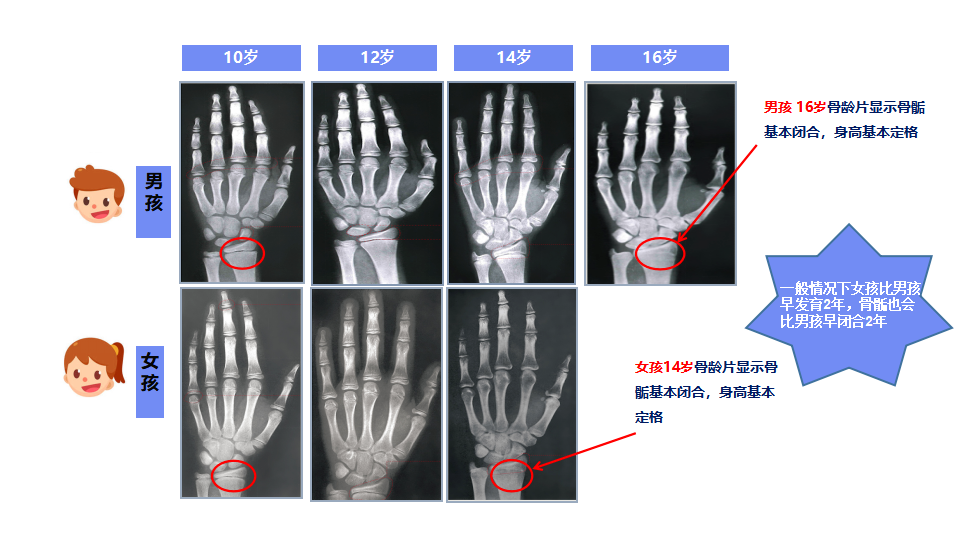 骨龄监测是医生在给孩子进行生长发育评估和疾病筛查、诊断和监测过程中的一个方法和工具,我们应当正确的看待骨龄,骨龄可协助诊断某些内分泌疾病和发育异常,但不能片面夸大骨龄对身高预测的作用,至于孩子是否需要查骨龄、什么时候查骨龄,建议先听从专业医生的指导。比起单纯焦虑孩子的身高问题,我们更建议带孩子定期进行全面的生长发育评估,得出准确结论,才能对孩子的生长问题才能做到早发现、早纠正、早应对。
