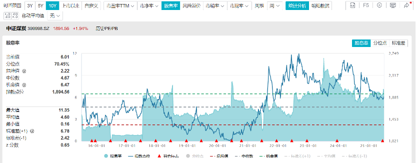 近日随着煤价下跌,煤炭板块有所回调,煤炭股息率进一步提升,中证煤炭指数(399998)当前股息率6%,位于近十年近70%分位数,具有较大的股息吸引力。煤炭作为相对稳定高股息的代表,受到中长线配置资金的青睐,从而支撑煤炭ETF的中长期走势。