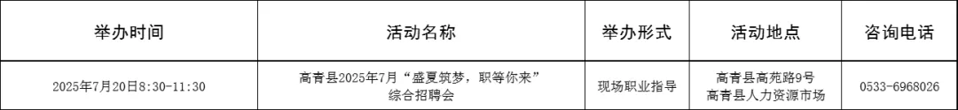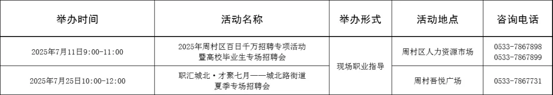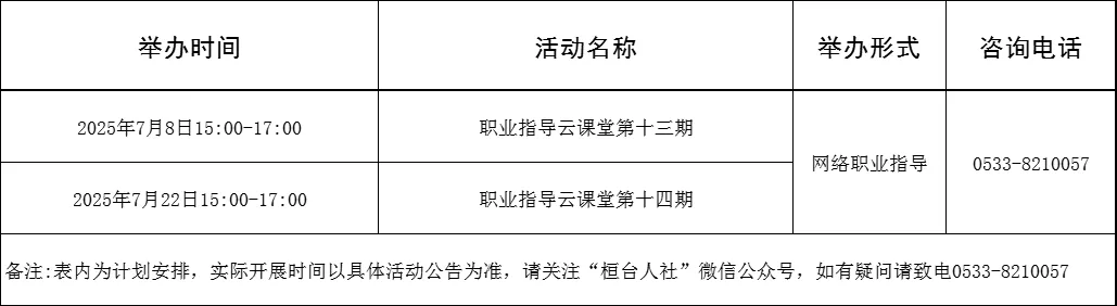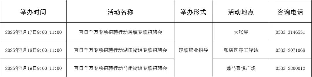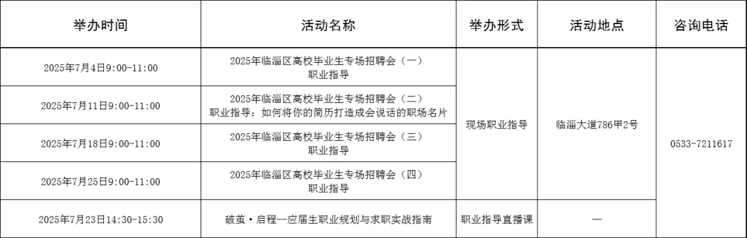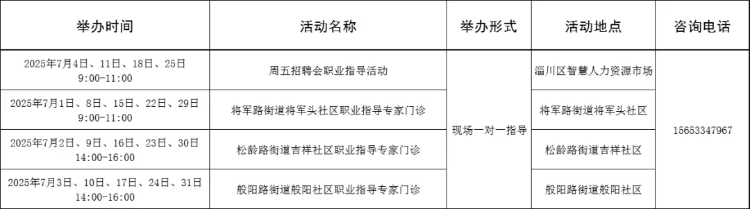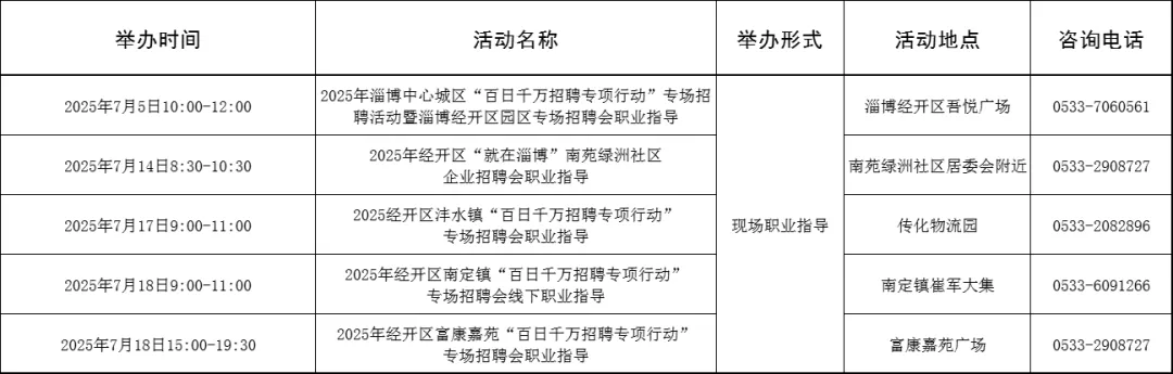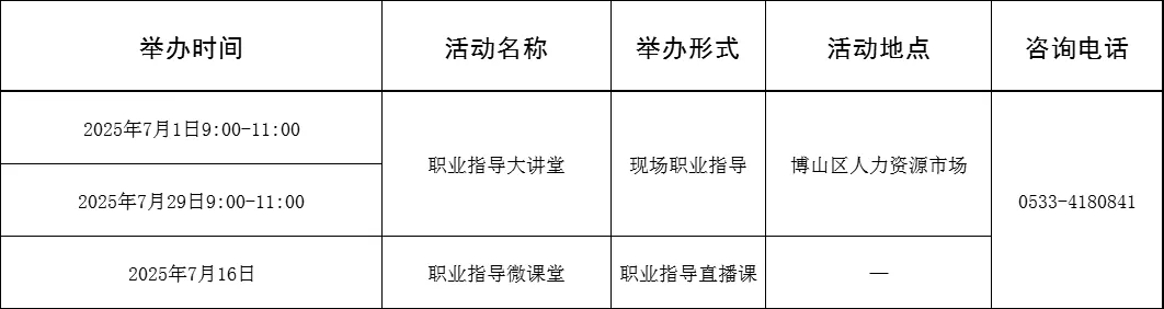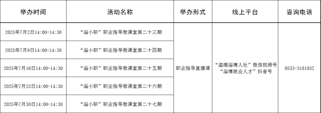 7月48场!淄博职业指导服务活动计划出炉 大众报业·齐鲁壹点 2025-07-09 近日,记者从淄博市人社局获悉,7月份,市人社部门将举办48场“职业指导专项活动”,其中,不仅有主题丰富的职业指导直播课、大讲堂,还有职业指导专家“一对一”开展指导服务。 市本级 张店区 淄川区 博山区 线上平台:“博山就业人才”抖音号 周村区 临淄区 线上平台:抖音号“临淄招聘”sdhgzyrcsc 桓台县 线上平台:“乐业桓台”抖音号 高青县 沂源县 高新区 经开区 责任编辑:李艳晨