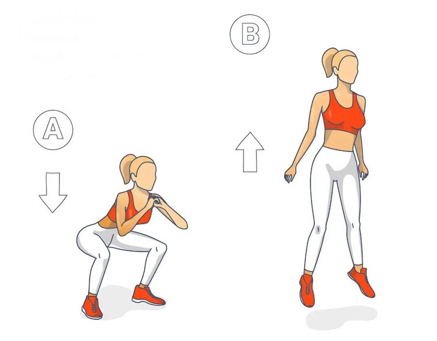 站立,双脚与肩同宽,双臂自然下垂;臀部向后坐,做深蹲动作,膝盖不超过脚尖,双臂向前伸直;从深蹲姿势起跳,尽量跳高,同时双臂向后摆动;落地时回到深蹲姿势。