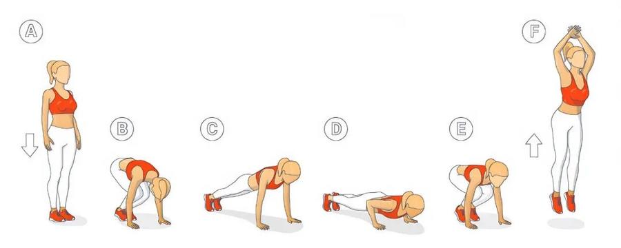 站立,双脚与肩同宽,双臂自然下垂;俯身下蹲,双手掌撑地,用力将双腿同时后蹬进入俯卧撑姿势;完成一个俯卧撑后,将双腿收回至下蹲姿势;起身跳跃,同时双臂向上举过头顶。