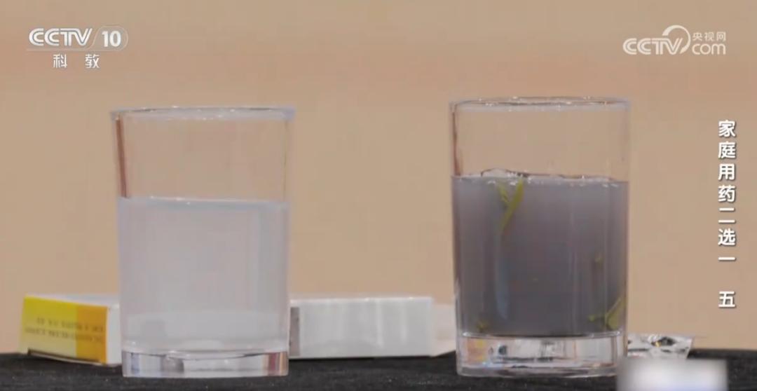 左边杯子里是白开水,右边杯子里是茶水,他们将琥珀酸亚铁片研碎,分别放进两个杯子,结果茶水那边发生了反应,茶水的颜色变得浑浊。显而易见,茶水送服药物必然会影响药效。