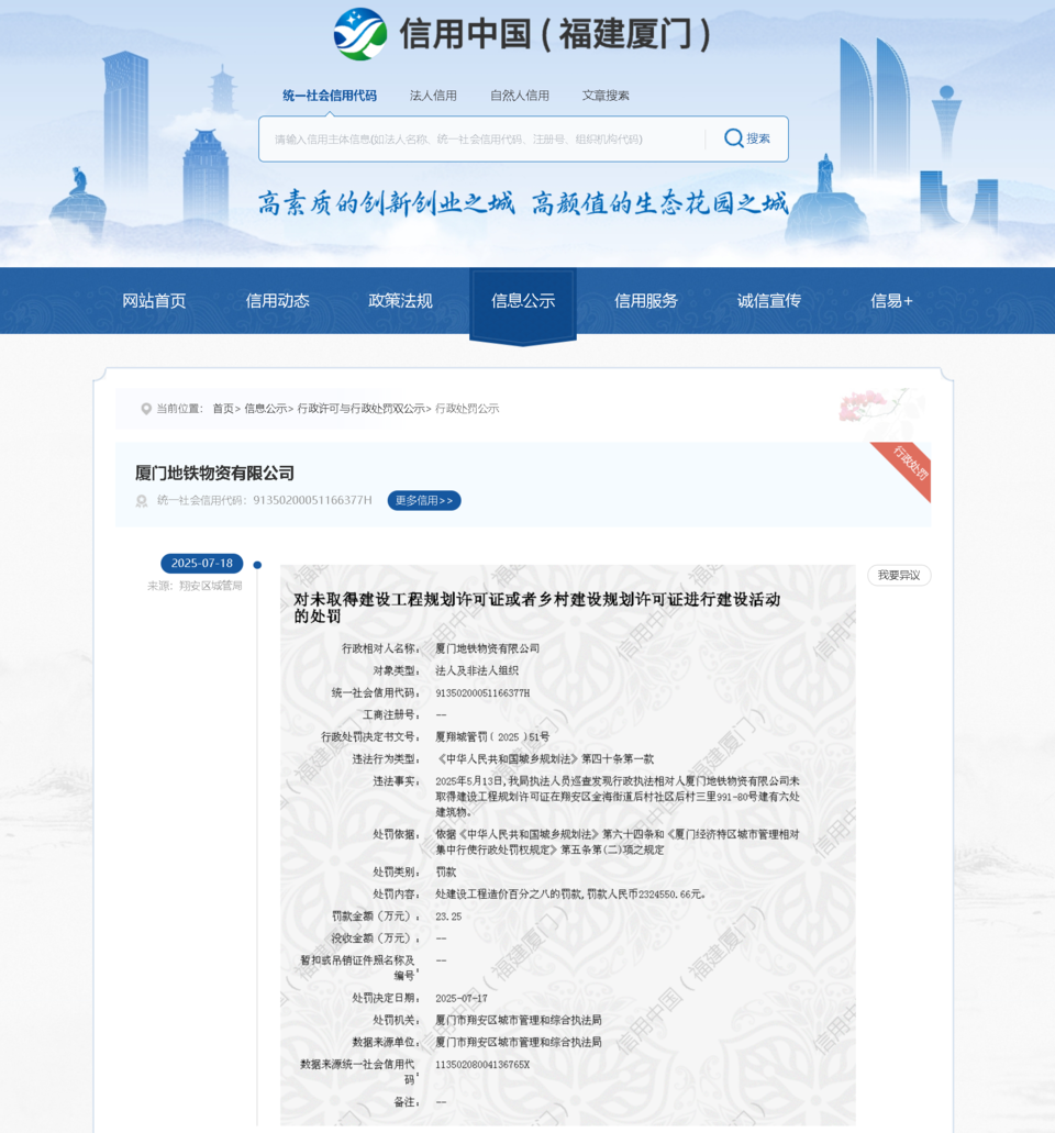 近日,记者从信用中国(福建厦门)获悉,厦门地铁物资有限公司因未取得建设工程规划许可证或者乡村建设规划许可证进行建设活动,被厦门市翔安区城市管理和综合执法局处罚。