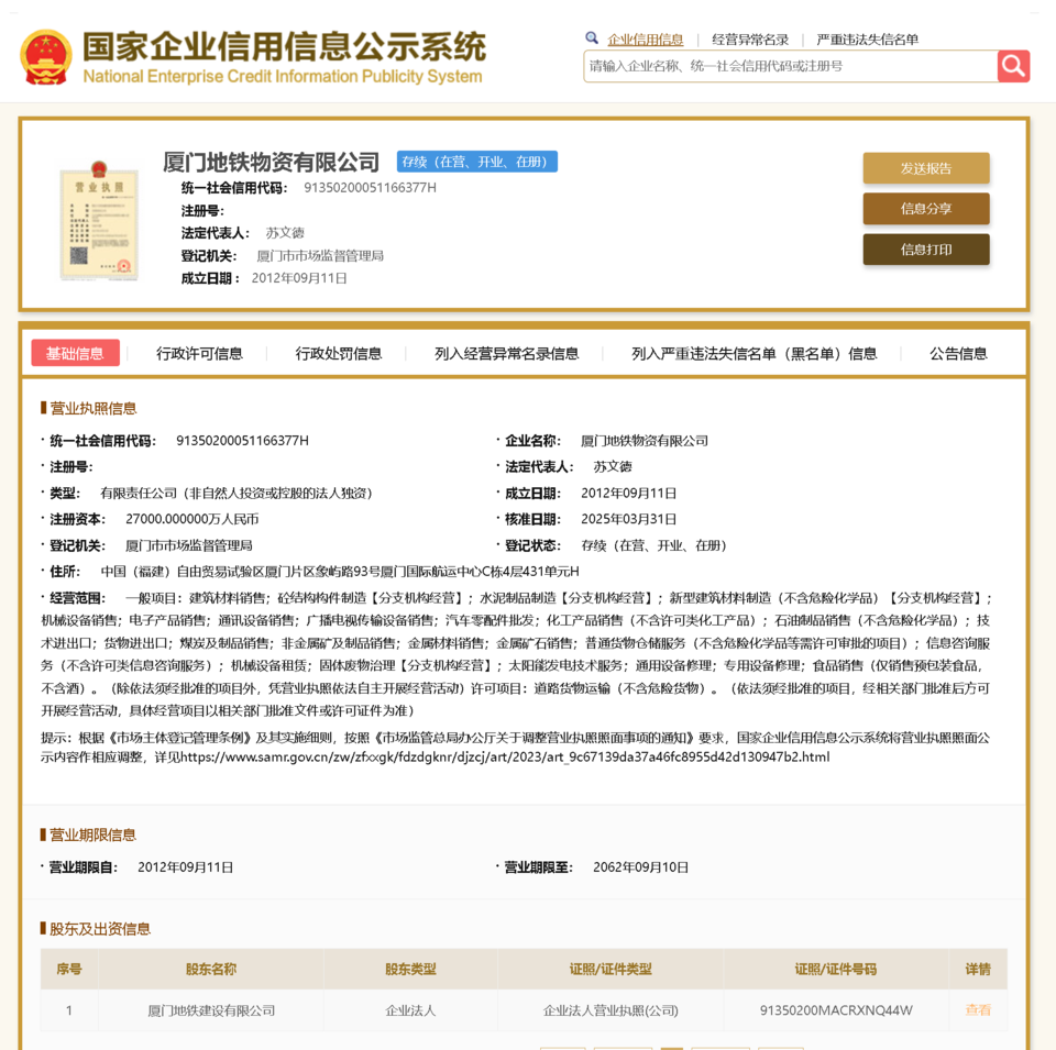 公开信息显示,厦门地铁物资有限公司成立于2012年9月11日,法定代表人苏文德,股东为厦门地铁建设有限公司。