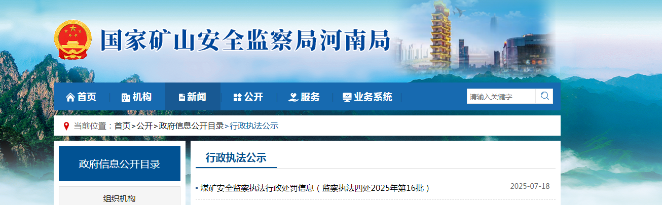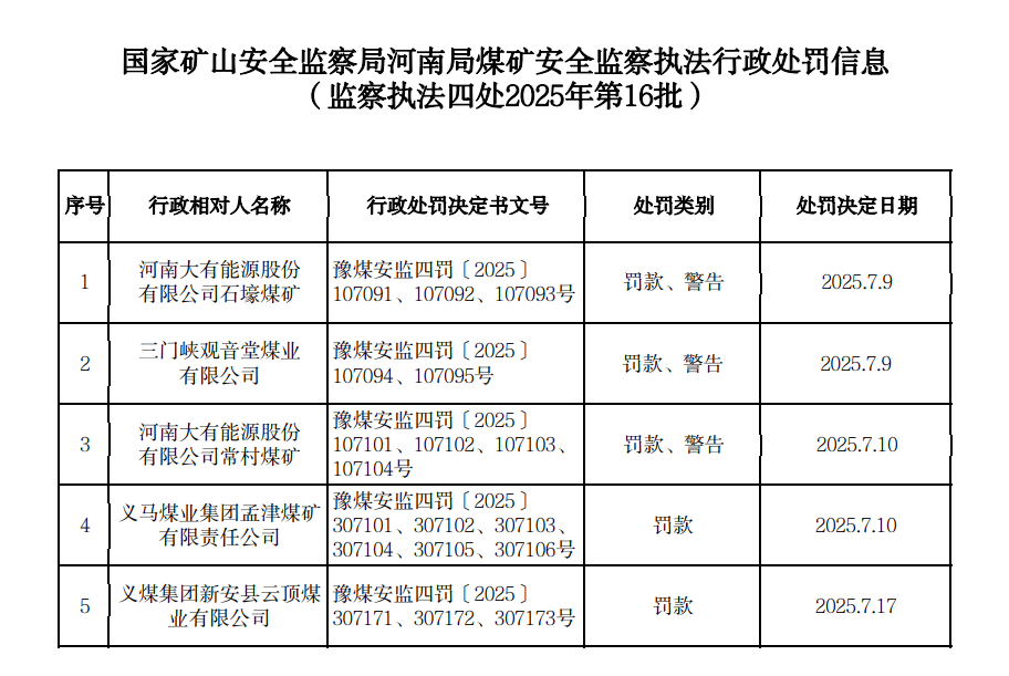 齐鲁晚报·齐鲁壹点记者于国家矿山安全监察局河南局行政执法公示栏获悉,7月18日,其公示了煤矿安全监察执法行政处罚信息(监察执法四处2025年第16批),义马煤业集团股份有限公司旗下的5家企业同时上榜。