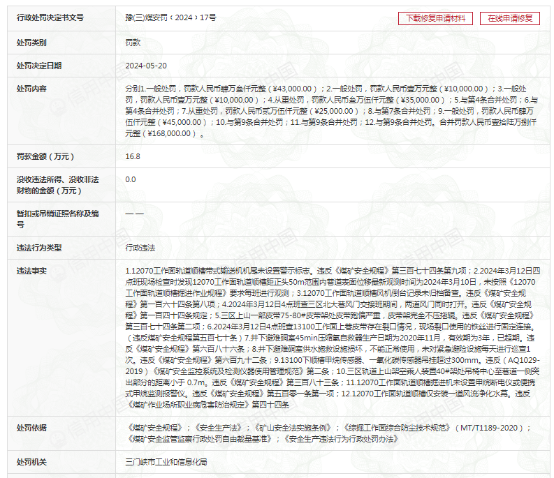 齐鲁晚报·齐鲁壹点记者于信用中国了解到,上述企业曾多次收到罚单。例如,在2024年5月20日,河南大有能源股份有限公司石壕煤矿因12项违法事实,被三门峡市工业和信息化局合并罚款16.8万元。行政处罚决定书文号是豫(三)煤安罚﹝2024﹞17号。