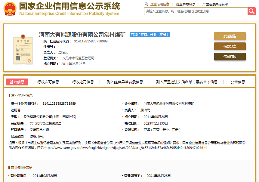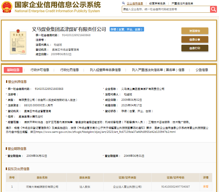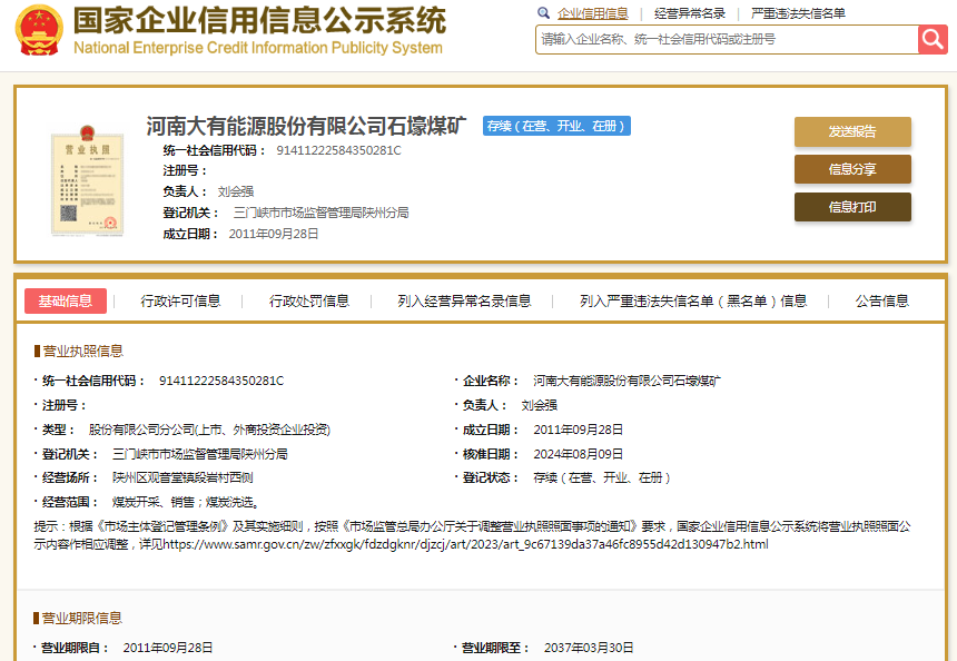 处罚信息显示,河南大有能源股份有限公司石壕煤矿行政处罚决定书文号为豫煤安监四罚〔2025〕107091、107092、107093号,处罚类别为罚款、警告。国家企业信用信息公示系统显示,其成立于2011年,负责人刘会强。其母公司为大有能源(600403.SH),后者大股东即义马煤业集团股份有限公司。