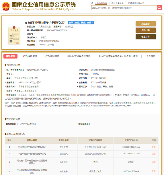 国家企业信用信息公示系统显示,义马煤业集团股份有限公司成立于1997年,注册资本421758.0035万元人民币,法定代表人为杨联合。