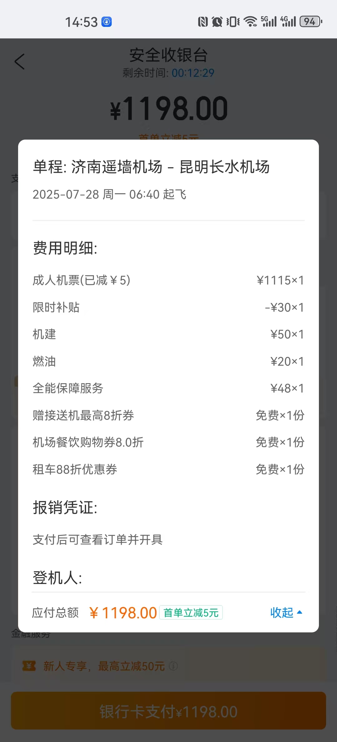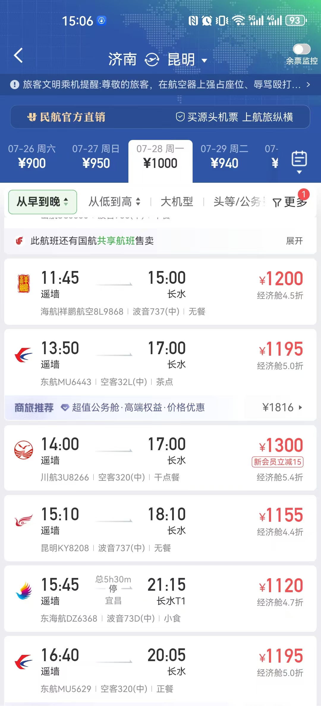 记者在同一时间分别在2家OTA平台与航旅纵横搜索济南-昆明航班,同一航班两家OTA价格分别为1198元与1215元,航旅纵横价格为1160元。