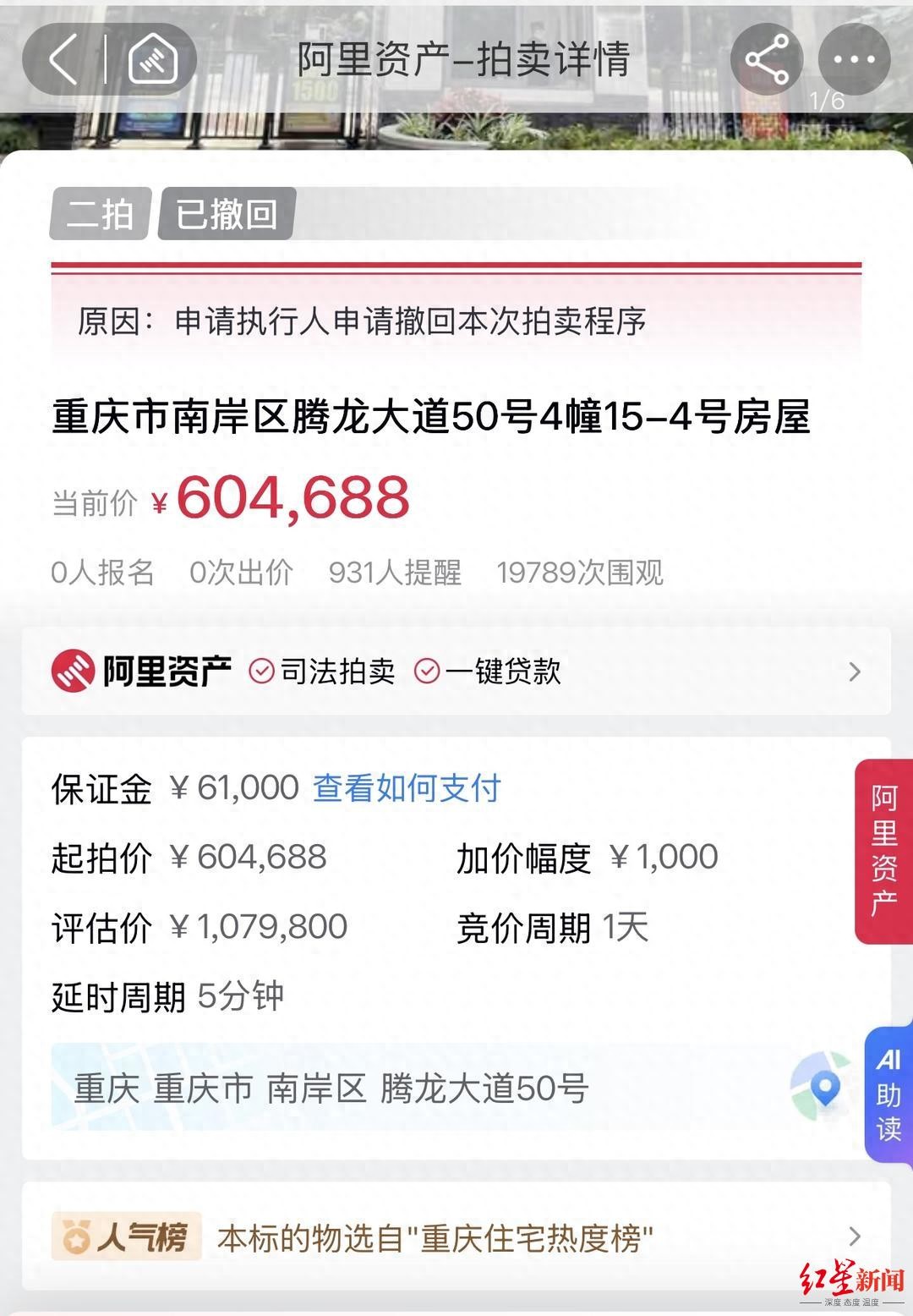 红星新闻7月23日报道,“重庆姐弟坠亡案”案发的房屋在阿里法拍平台拍卖的消息,引发广泛关注。7月25日,因“申请执行人申请撤回本次拍卖程序”,阿里法拍平台显示原本二次拍卖的房屋,再次撤回拍卖,撤回时该房屋0人报名,有近2万次围观,900多人订阅,位于法拍平台重庆地区“住宅人气榜”榜单第2名。