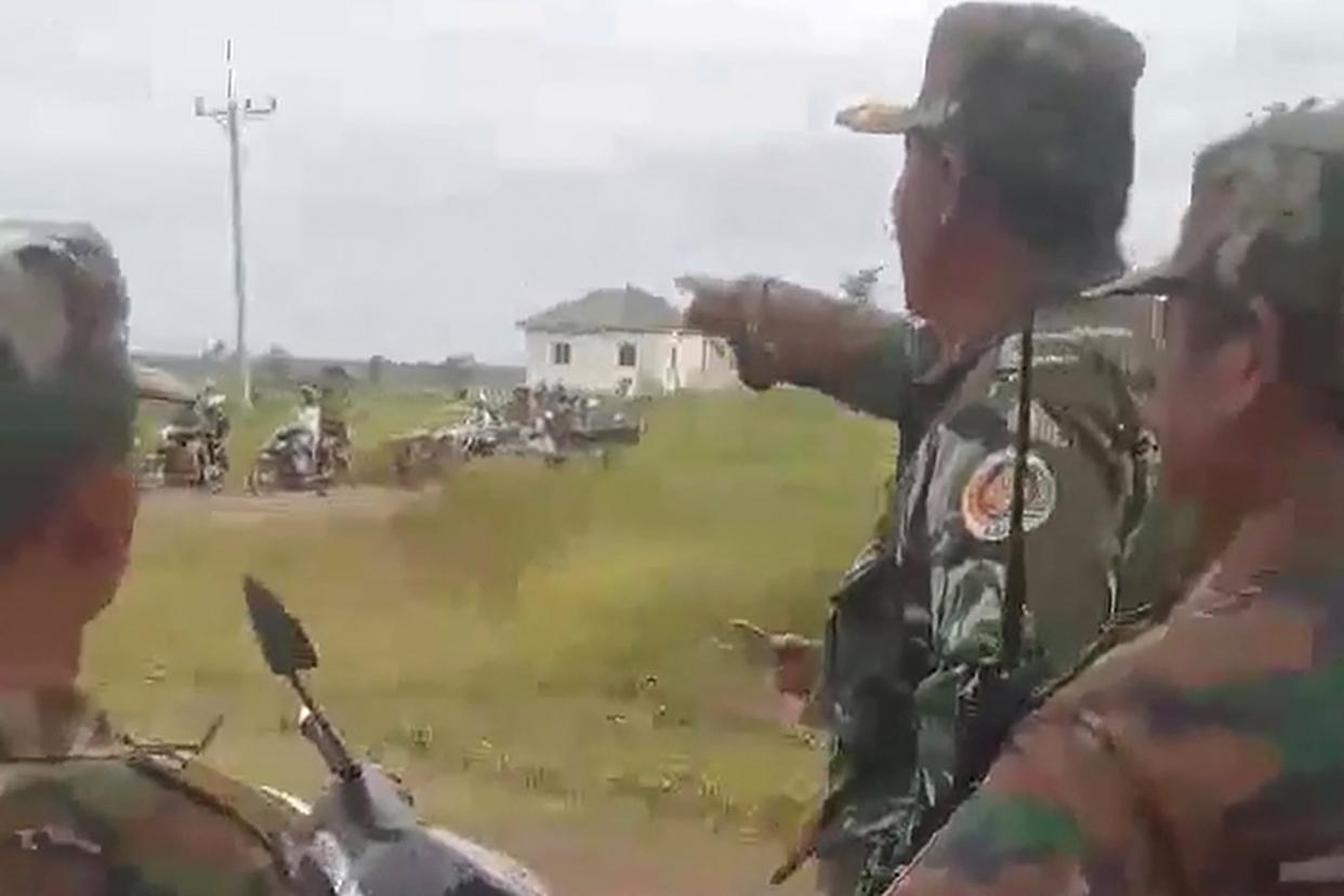24日,柬埔寨士兵望向从柏威夏省柬泰边境撤离的民众。新华社