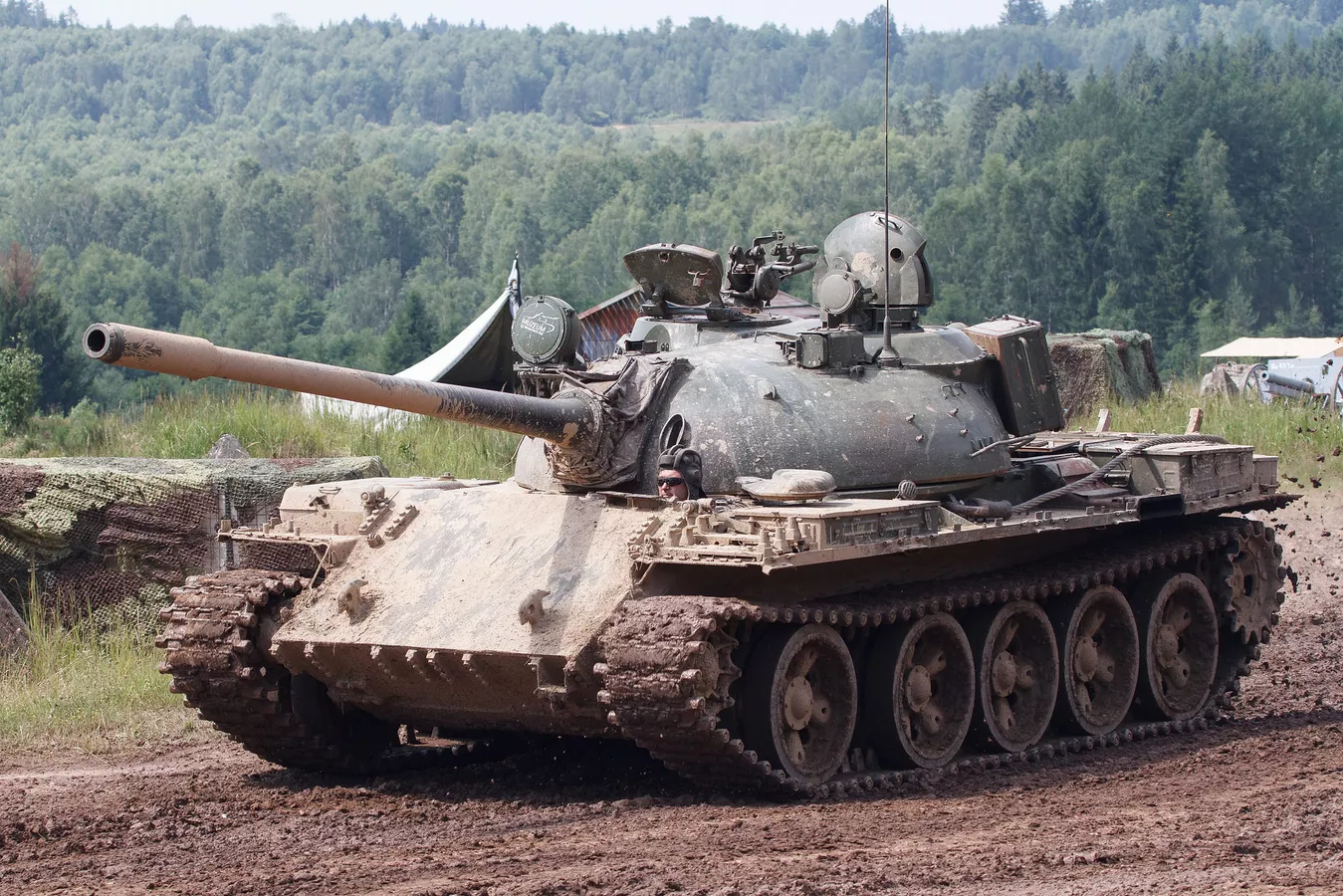 T-55配备100毫米线膛炮和7.62毫米并列机枪,装甲厚度为200毫米,发动机功率580马力,最高时速50公里,最大行程500公里,乘员4人。与上一代坦克相比,T-55的主要特点是安装了核防护系统,这是应当时的冷战环境需求而研制的。