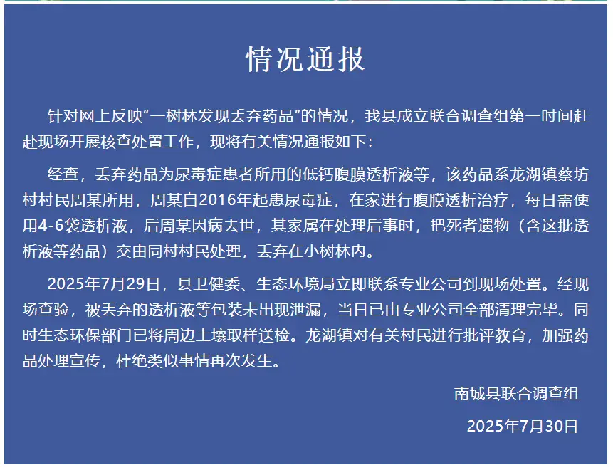 2025年7月29日,县卫生健康委、生态环境局立即联系专业公司到现场处置。经现场查验,被丢弃的透析液等包装未出现泄漏,当日已由专业公司全部清理完毕。同时生态环保部门已将周边土壤取样送检。龙湖镇对有关村民进行批评教育,加强药品处理宣传,杜绝类似事情再次发生。