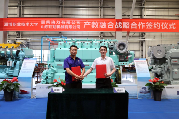 近日,淄博职业技术大学与淄柴动力有限公司、山东巨明机械有限公司产教融合战略合作签约仪式举行。学校党委书记刘伟与淄柴动力有限公司、山东巨明机械有限公司党委书记、董事长郭亮为淄博职业技术大学产教融合人才培养基地揭牌。
