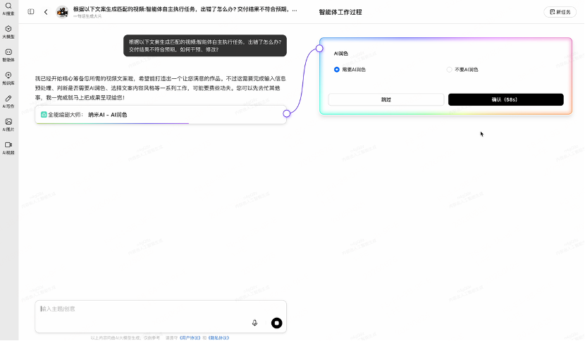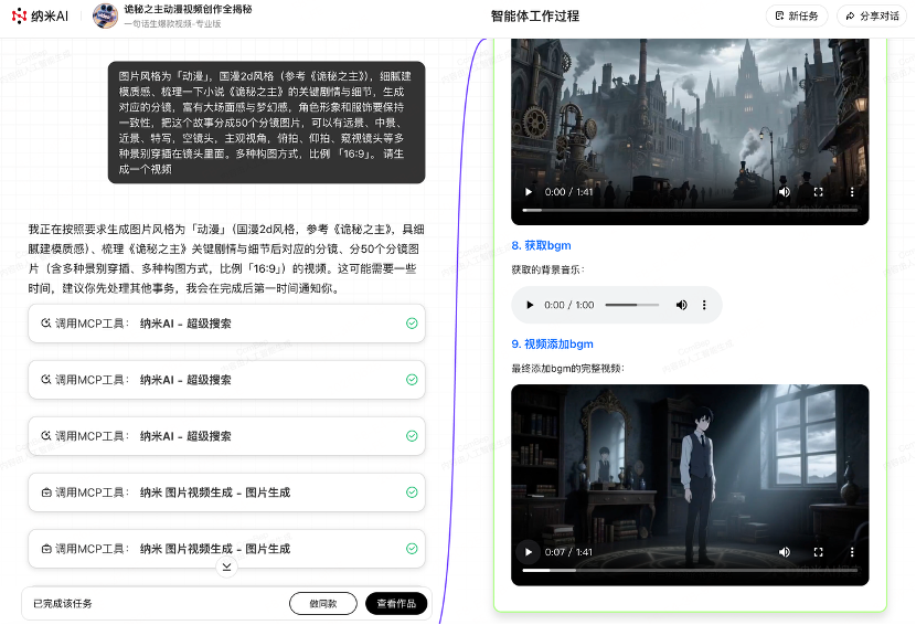 纳米AI打造了国内首个“一句话生成大片”多智能体蜂群,从脚本、分镜、画面、配音、配乐到剪辑成片,使用L1-到L3级智能体,完成这个任务至少两小时,现在仅需20分钟。