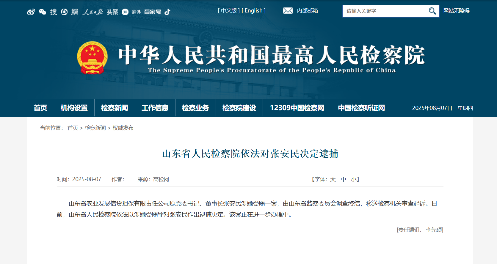 山东省人民检察院依法对张安民决定逮捕 大众报业·齐鲁壹点 2025-08-07 1.6万 齐鲁晚报·齐鲁壹点记者 于民星 8月7日,记者从最高人民检察院官网获悉,山东省人民检察院依法对张安民决定逮捕。通报显示,山东省农业发展信贷担保有限责任公司原党委书记、董事长张安民涉嫌受贿一案,由山东省监察委员会调查终结,移送检察机关审查起诉。日前,山东省人民检察院依法以涉嫌受贿罪对张安民作出逮捕决定。该案正在进一步办理中。 责任编辑:于民星
