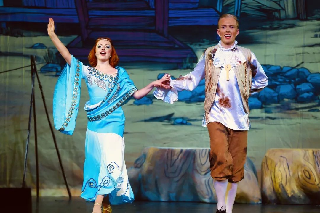 这舞台效果也太绝了!多媒体投影让茂密丛林“长”满舞台,特效灯光瞬间切换晴空与暴雨,连海浪拍岸的水雾都带着咸湿的气息。当鲁滨逊和“星期五”的友谊故事展开,逼真的布景和生动的表演让孩子们忍不住喊:“好像真的在岛上探险!”
