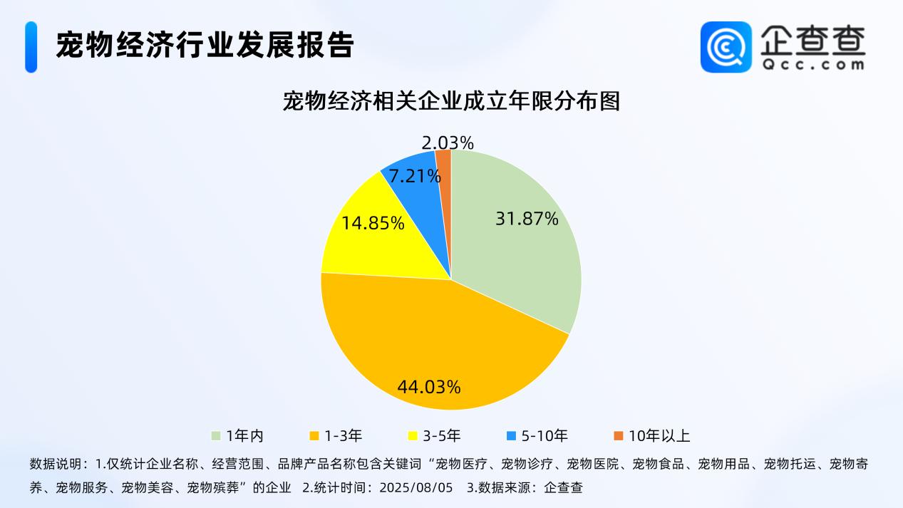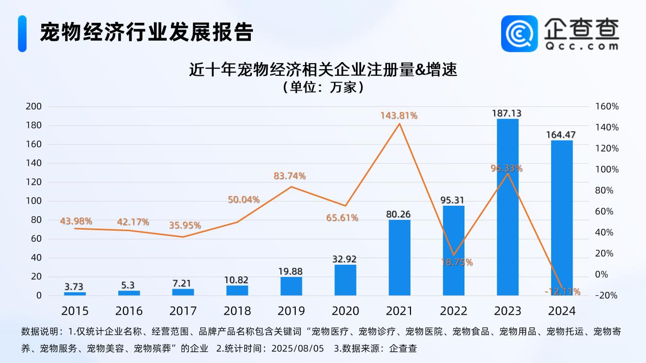 2023年,宠物经济相关企业全年注册量首次突破百万家,达187.13万家,同比增长96.33%。2024年全年注册164.47万家相关企业,虽较前一年有所下滑,但仍处于高位。截至目前,今年已注册96.55万家,其中前7月注册95.39万家,同比略增1.67%。