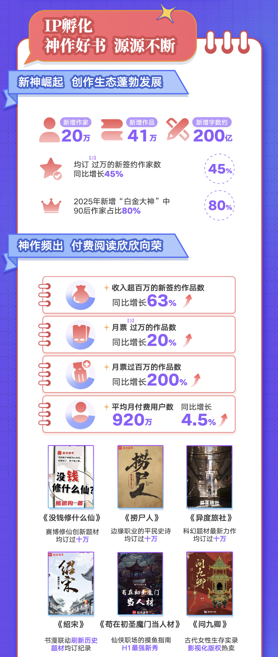 得益于阅文创作生态不断完善的“造血机制”,优秀的新人作家不断涌现,新签约的作家中达成均订过万的作家数量同比增长45%。2025年新增白金大神中90后作家占比近八成,并出现多位95后新锐作家。新生代创作力量带动在线阅读神作频出,阅文新签约的作品中收入超过100万元的数量同比增长63%,《没钱修什么仙》《捞尸人》《异度旅社》均订更是突破十万大关。