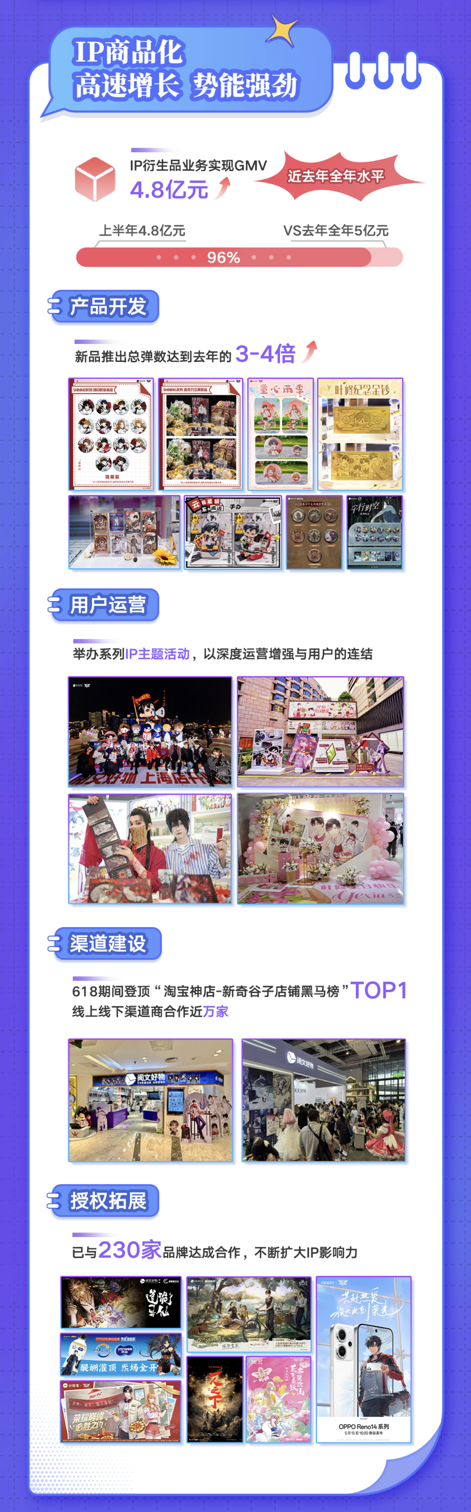 同样,阅文的IP衍生品业务也展现出了极强的增长势能,上半年GMV高达4.8亿元,接近去年全年水平。快速增长的背后,是阅文好物在产品力、渠道力、运营力及授权拓展等方面的持续深耕。产品开发方面,阅文好物在原画、设计和工艺等全链路上取得了突破,新品推出速度达到去年的3-4倍;渠道建设方面,阅文好物已与近万家线上线下渠道商合作,其天猫旗舰店在618期间登顶“淘宝神店-新奇谷子店铺黑马榜”榜首;用户运营方面,阅文好物通过深度运营增强与用户的连结,围绕《全职高手》《诡秘之主》《道诡异仙》等头部IP举办主题活动,备受粉丝欢迎;授权拓展方面,阅文好物已与230家品牌达成合作,进一步扩大了IP影响力。