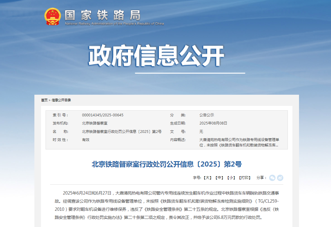 齐鲁晚报·齐鲁壹点记者于国家铁路局官网了解到,8月8日,其公示了北京铁路督察室行政处罚公开信息〔2025〕第2号。据悉,被行政处罚单位为大唐河北发电公司旗下的大唐清苑热电有限公司(下称“大唐清苑热电”)。