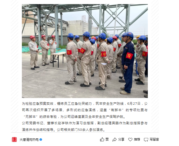 6月27日,即处罚公开信息所示的第二次事故发生日,大唐清苑热电公众号再次发布稿件称,为检验应急预案实效,锤炼员工应急处突能力,筑牢安全生产防线,6月27日公司再次组织开展了多场景、多形式的应急演练,涵盖“有脚本”的专项处置与“无脚本”的综合考验,为公司迎峰度夏及全年安全生产保驾护航。公司党委书记、董事长赵学轶作为演习总指挥,副总经理吴鹏作为副总指挥参与演练并作总结和指导。公司相关部门50余人参加演练。