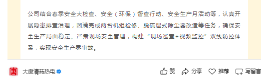 值得注意的是,在6月24日,大唐清苑热电官方公众号发布文章《决战决胜“双过半”》,其称,公司结合春季安全大检查、安全(环保)督查行动、安全生产月活动等,认真开展隐患排查治理。构建“现场巡查+视频监控”双线防控体系,实现安全生产零事故。据上述处罚公开信息,当日,其管内专用线发生事故。