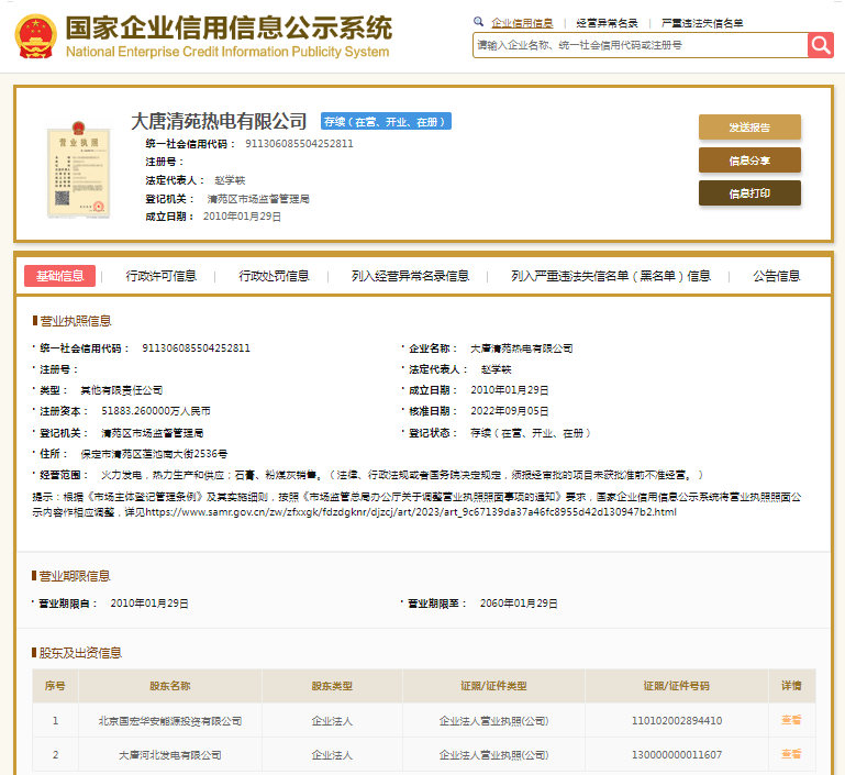 国家企业信用信息公示系统显示,大唐清苑热电有限公司成立于2010年,注册资本51883.26万元人民币,法定代表人为赵学轶,大股东为大唐河北发电有限公司,持股比例99.04%。