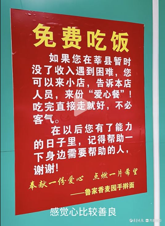 莘县香麦园手擀面店门口,一张朴素告示悄然温暖过路人的心:“如果您在莘县暂时没了收入遇到困难……吃完直接走就好。”当一碗热面被轻轻推到桌前,老板李爱香眼中微光闪动,“咱就是想让困难的人能感受到一份温暖”。这碗面的意义,早已超越了一餐饱食。