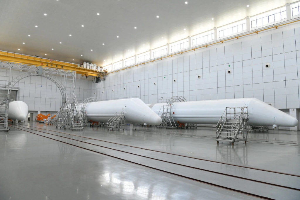 中国航天科技集团八院负责抓总研制4个3.35米助推器,为全箭提供了90%以上的起飞推力,是长征五号乙运载火箭起飞的主要动力源。图为厂房内的助推器。
