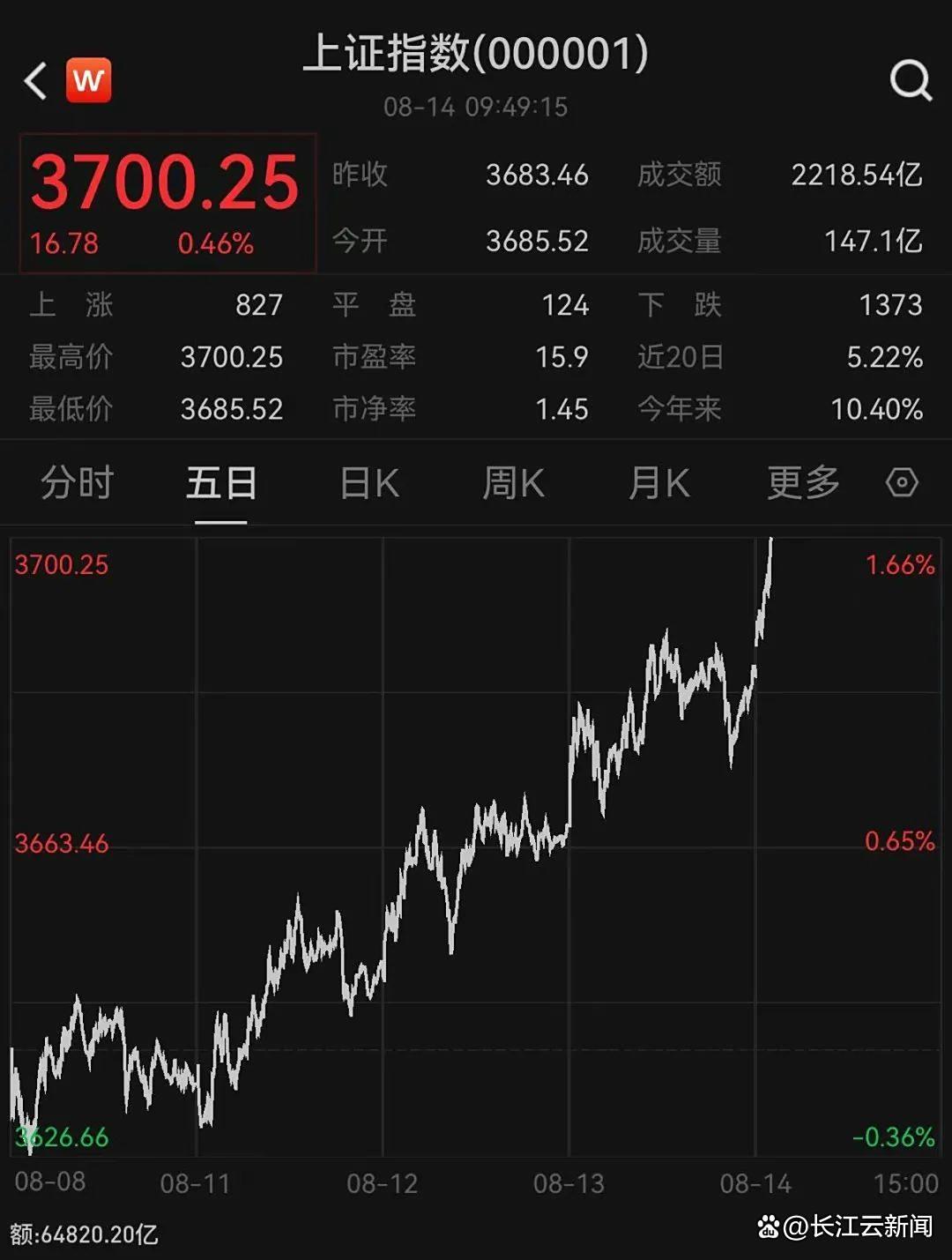 沪指突破3700点,为2021年9月以来首次 长江云新闻 2025-08-14 1663 8月14日开盘,A股三大股指涨跌不一,沪指高开,盘中突破3700点,再创近四年新高。截至发稿涨0.46%,报3700.25点,深证成指涨0.18%,创业板指涨0.14%。 截至13日收盘,沪指涨0.48%实现八连阳,报3683.46点,收盘价创2021年9月13日以来的新高。 (长江云新闻) 责任编辑:崔可腾