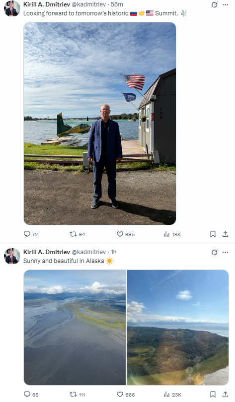 此外,负责与外国投资和经济合作事务的俄罗斯总统特别代表、俄直接投资基金总裁德米特里耶夫也于安克雷奇当地时间周四在社交平台X上连续发布帖文,称自己已抵达阿拉斯加。↓