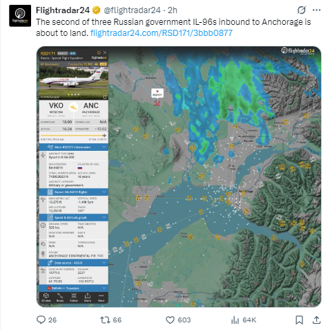 值得注意的是,Flightradar24也于安克雷奇当地时间周四在社交平台X上发布最新帖文称,“飞往安克雷奇的三架俄罗斯政府伊尔-96飞机中的第二架即将着陆”,并配上了相关航迹图。↓