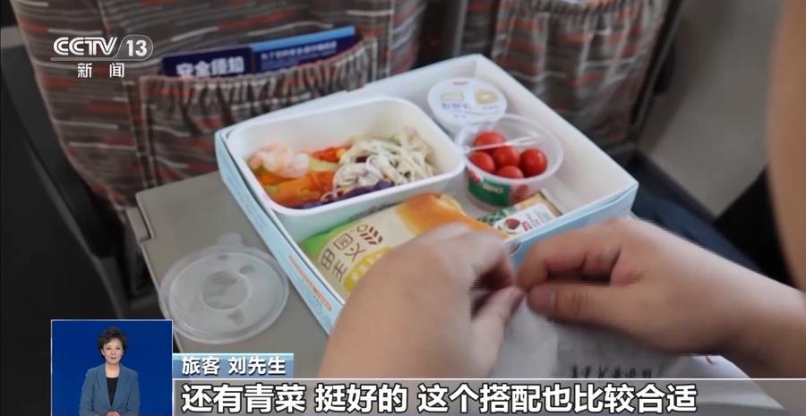 旅客刘先生:我看着有虾仁、鸡肉、青菜,挺好的。现在我正在减肥,这个挺适合我的。